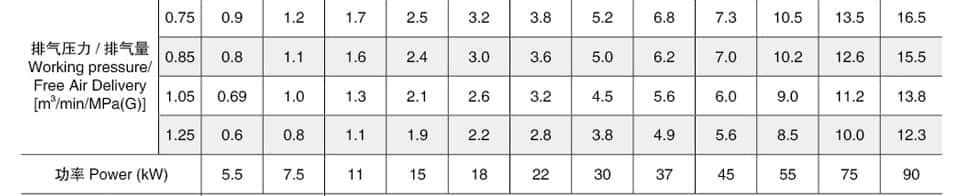 | 排氣壓力 / 排氣量[m3/min/MPa(G) | 0.75 | 21.5 | 26.2 | 28.7 | 32.0 | 36.7 | 43.5 | 50.6 | 58.0 | 68.8 | ||||||||||||