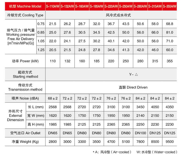 | 機(jī)型 | S-110A/W | S-132A/W | S-160A/W | S-185A/W | S-220A/W | S-250A/W | S-280A/W | S-315A/W | S-355A/W | |||||||||||||