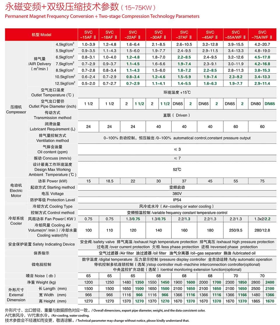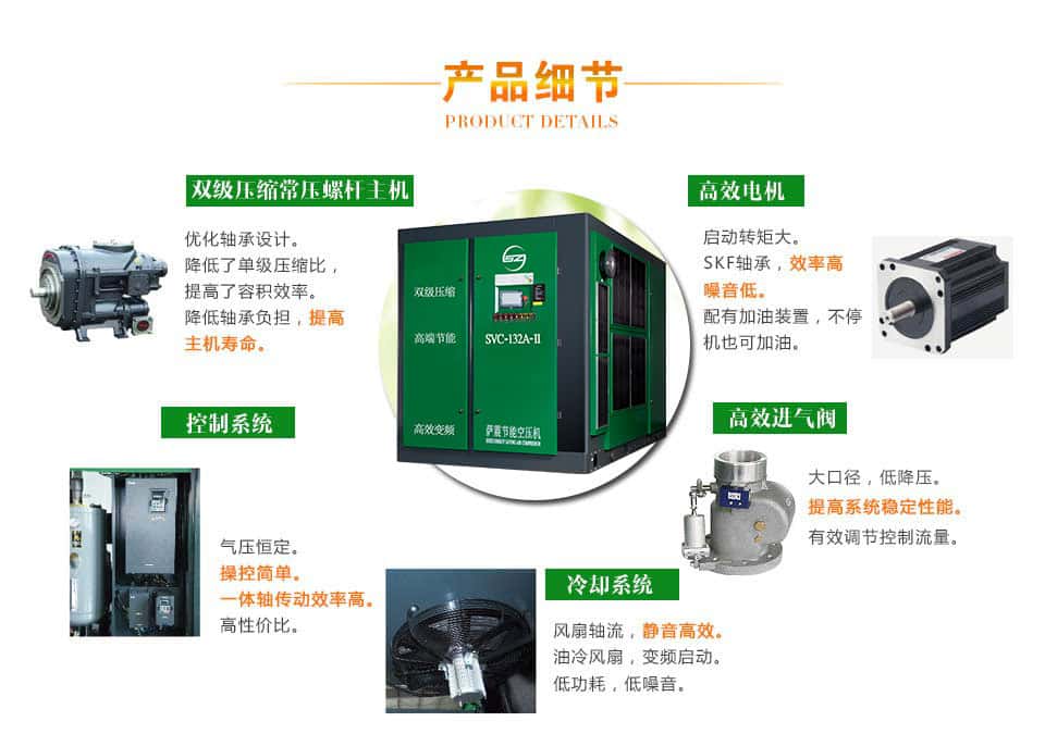 采用德國薩震空壓機主機,無振動,低噪音,大轉子,低轉速,強大的心臟決定了整機的優(yōu)異性能。轉子經(jīng)嚴格的動, 靜平衡試驗, 使其運轉平衡更好, 振動更小, 噪聲更低,同時在直徑不變的情況下,轉子長度增加,有效壓縮面積增加,從而達到流量增加,功耗降低。