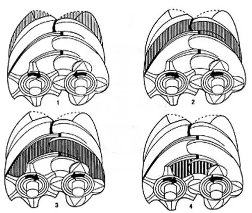 我們以螺桿空壓機(jī)為例,螺桿壓縮機(jī)的工作循環(huán)可分為進(jìn)氣,壓縮和排氣三個過程。隨著轉(zhuǎn)子旋轉(zhuǎn),每對相互嚙合的齒相繼完成相同的工作循環(huán)。