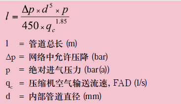 管道網(wǎng)絡(luò)中特定壓降,最長的允許長度可以使用下列計算公式,薩震節(jié)能空壓機與您一起計算下:
